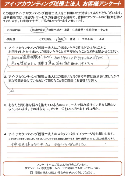 初めての遺産相続だったので、分からないことが多かったのですが、色々な質問に対し丁寧に答えて頂き助かりました。